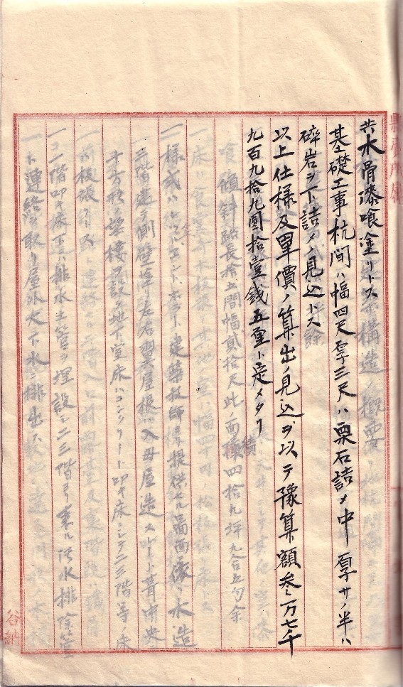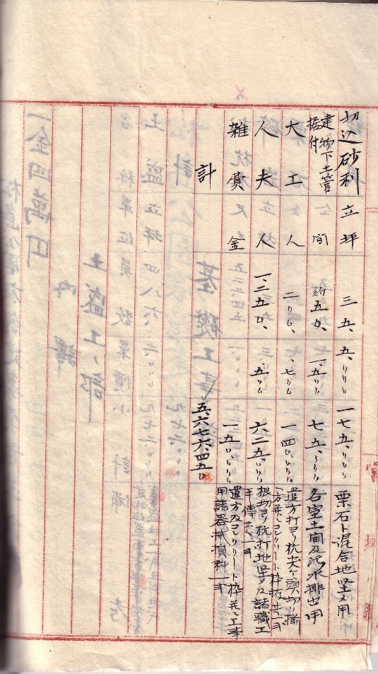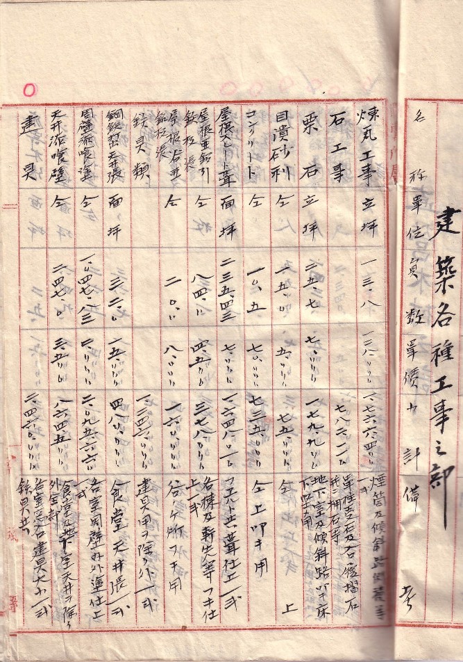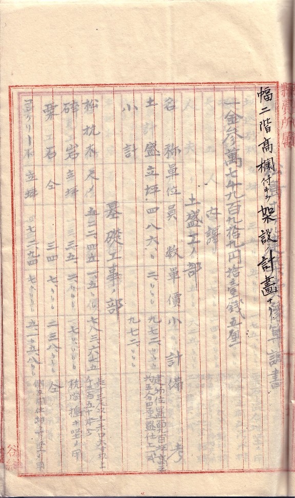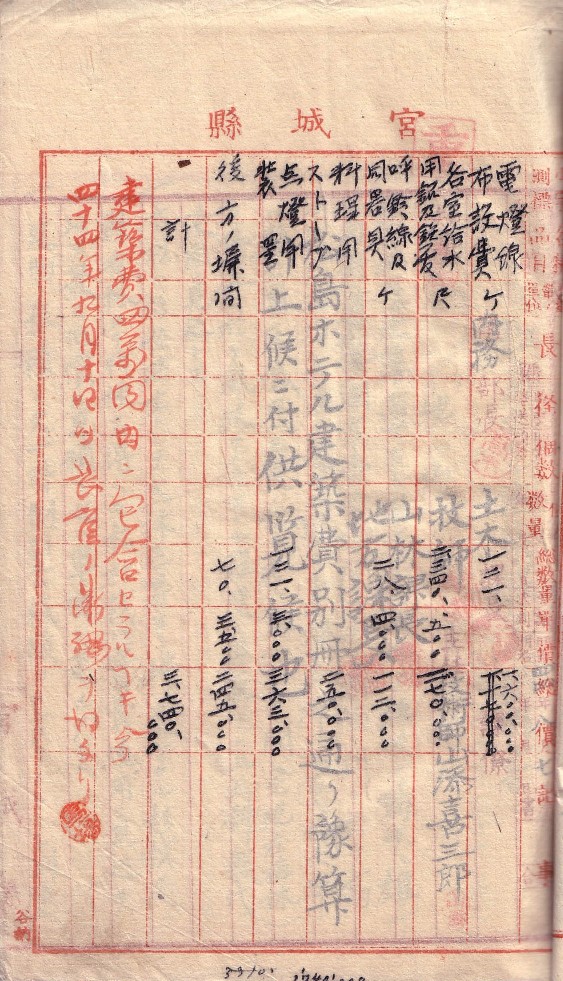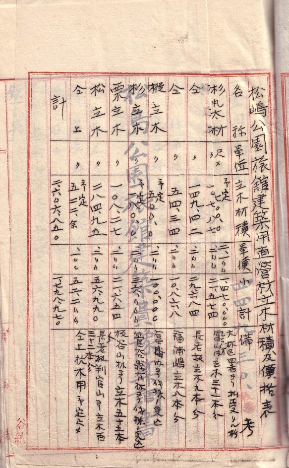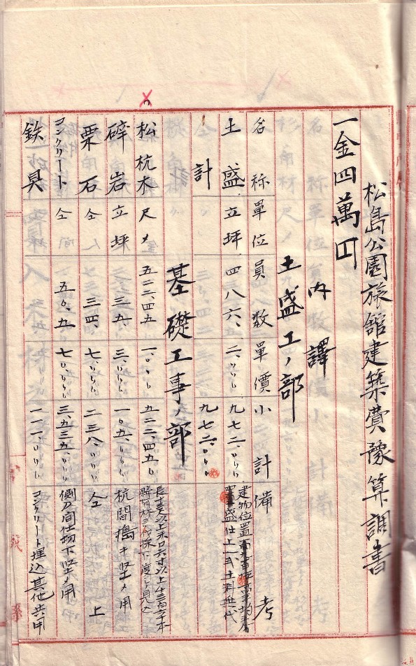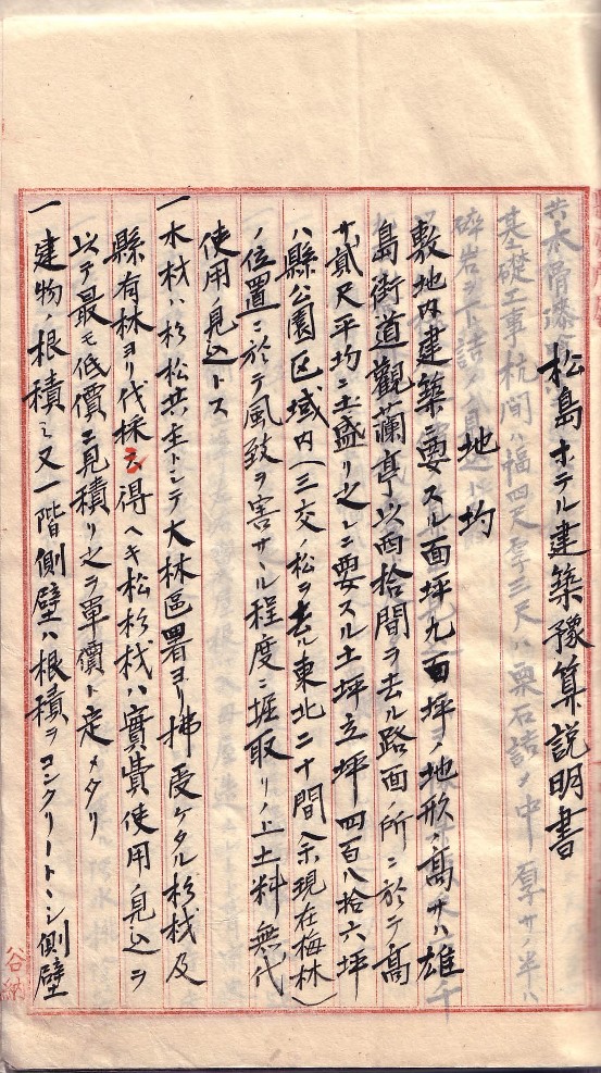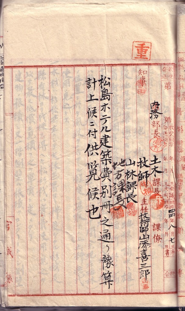 宮城県庁の主任技術師の山添喜三郎が作成した、松島パークホテル建築費の予算計上書類です。